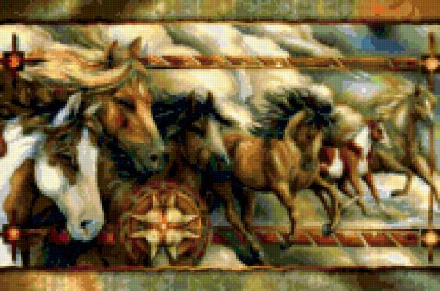 Ориентировочно так, схема вышивки «Дикий табун», созданная автором palena29, будет выглядеть при отшиве на канве. Размер данной вышивки равен 190x126 крестов, при этом используется 82 цветов. Ключевые слова, по которым можно найти эту схему: живопись, jody bergsma. Также, вы можете взглянуть на оригинальную картинку, соответствующую данной схеме вышивки.
