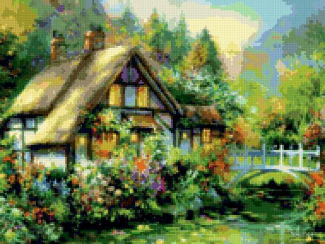 Ориентировочно так, схема вышивки «Дом на берегу реки», созданная автором smorodina2410, будет выглядеть при отшиве на канве. Размер данной вышивки равен 190x143 крестов, при этом используется 64 цветов. Ключевые слова, по которым можно найти эту схему: дом, природа, цветы, река, берег, горы, лес. Также, вы можете взглянуть на оригинальную картинку, соответствующую данной схеме вышивки.