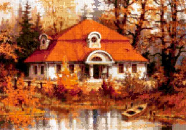 Ориентировочно так, схема вышивки «Дом на берегу реки», созданная автором smorodina2410, будет выглядеть при отшиве на канве. Размер данной вышивки равен 190x133 крестов, при этом используется 67 цветов. Ключевые слова, по которым можно найти эту схему: дом, двор, природа, быт, осень, река, лес. Также, вы можете взглянуть на оригинальную картинку, соответствующую данной схеме вышивки.