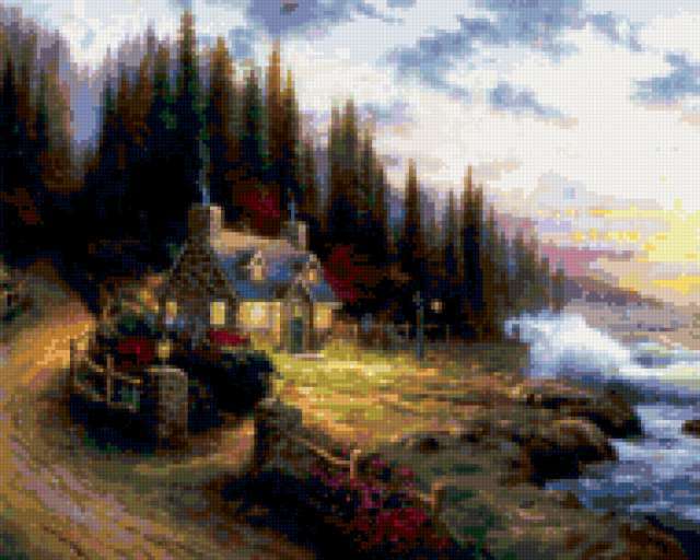 Ориентировочно так, схема вышивки «Дом на берегу», созданная автором Svetla_Nochka, будет выглядеть при отшиве на канве. Размер данной вышивки равен 190x152 крестов, при этом используется 73 цветов. Ключевые слова, по которым можно найти эту схему: лес, дом, дома, замки, берег, море, озеро, природа, пейзаж, картина, домик, домики. Также, вы можете взглянуть на оригинальную картинку, соответствующую данной схеме вышивки.