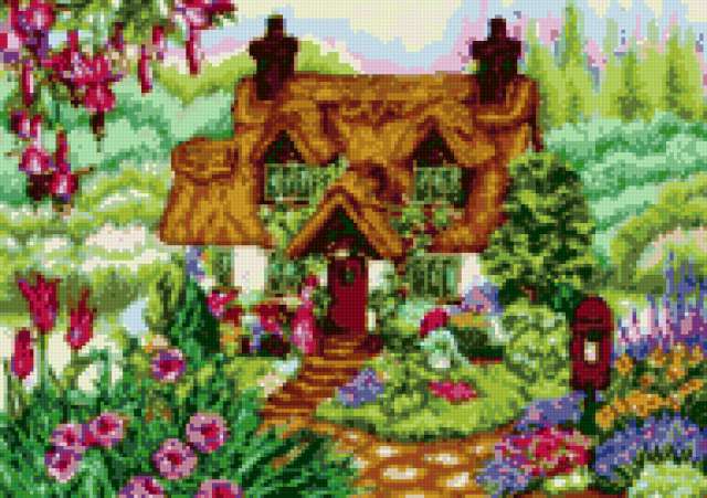 Ориентировочно так, схема вышивки «Домик в цветах», созданная автором poltanya, будет выглядеть при отшиве на канве. Размер данной вышивки равен 190x134 крестов, при этом используется 41 цветов. Ключевые слова, по которым можно найти эту схему: домик, домики, палисадник, сад, пейзаж, природа, уютный уголок, райский уголок. Также, вы можете взглянуть на оригинальную картинку, соответствующую данной схеме вышивки.