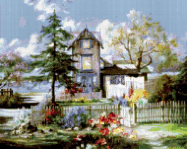Ориентировочно так, схема вышивки «Домик», созданная автором filin2791, будет выглядеть при отшиве на канве. Размер данной вышивки равен 190x151 крестов, при этом используется 82 цветов. Ключевые слова, по которым можно найти эту схему: домик. Также, вы можете взглянуть на оригинальную картинку, соответствующую данной схеме вышивки.