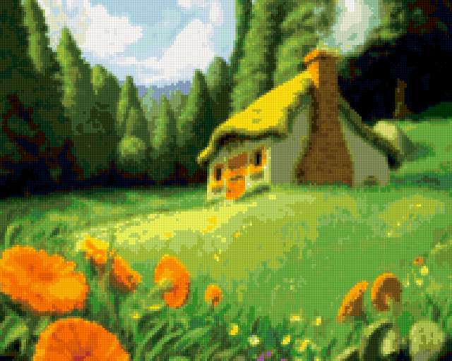 Ориентировочно так, схема вышивки «Домик», созданная автором eldi_22, будет выглядеть при отшиве на канве. Размер данной вышивки равен 190x152 крестов, при этом используется 58 цветов. Ключевые слова, по которым можно найти эту схему: домик. Также, вы можете взглянуть на оригинальную картинку, соответствующую данной схеме вышивки.