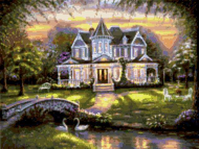 Ориентировочно так, схема вышивки «Дом», созданная автором allllla, будет выглядеть при отшиве на канве. Размер данной вышивки равен 190x143 крестов, при этом используется 76 цветов. Ключевые слова, по которым можно найти эту схему: дом, пейзаж, картина, домик, домики, лебеди, пруд, прудик, природа. Также, вы можете взглянуть на оригинальную картинку, соответствующую данной схеме вышивки.