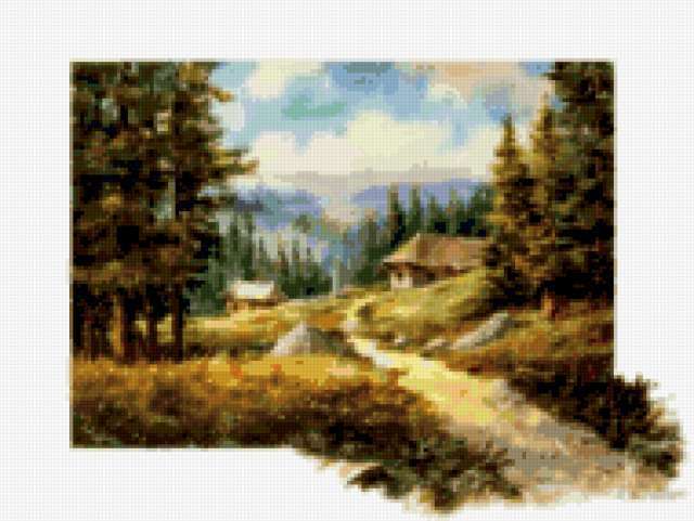 Ориентировочно так, схема вышивки «Дорога в детство», созданная автором lucha, будет выглядеть при отшиве на канве. Размер данной вышивки равен 190x143 крестов, при этом используется 76 цветов. Ключевые слова, по которым можно найти эту схему: лето, домики, пейзаж, природа. Также, вы можете взглянуть на оригинальную картинку, соответствующую данной схеме вышивки.