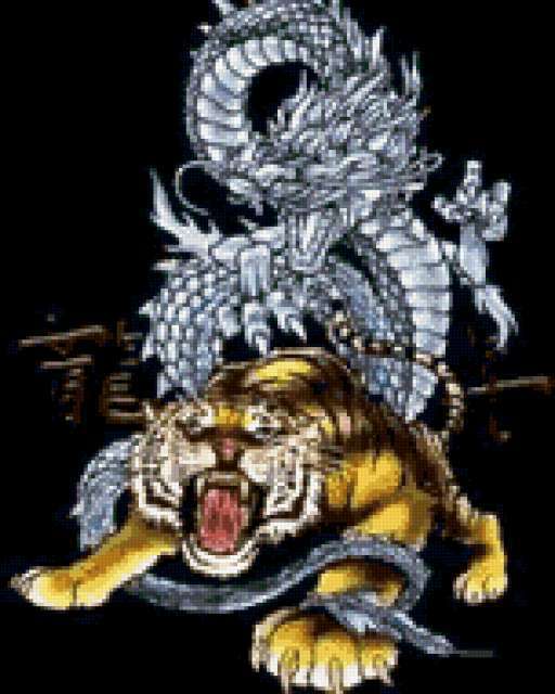 Ориентировочно так, схема вышивки «Дракон и тигр», созданная автором Nastyshok, будет выглядеть при отшиве на канве. Размер данной вышивки равен 152x190 крестов, при этом используется 71 цветов. Ключевые слова, по которым можно найти эту схему: дракон. Также, вы можете взглянуть на оригинальную картинку, соответствующую данной схеме вышивки.