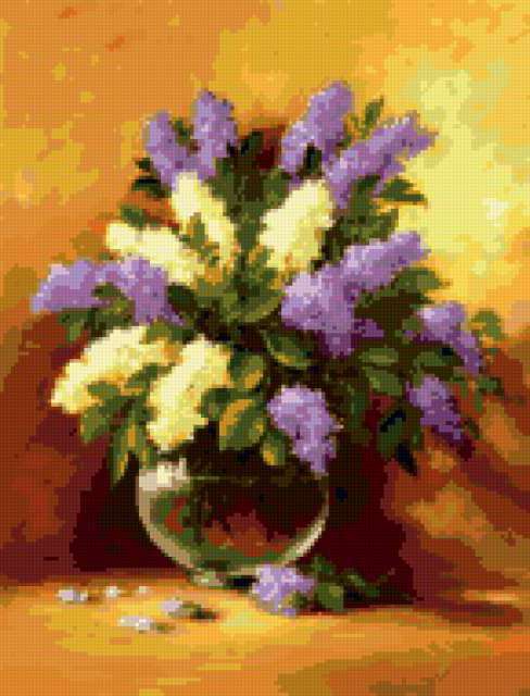 Ориентировочно так, схема вышивки «Душистая сирень», созданная автором poltanya, будет выглядеть при отшиве на канве. Размер данной вышивки равен 145x190 крестов, при этом используется 37 цветов. Ключевые слова, по которым можно найти эту схему: букет, букеты, цветы, флора, нежные акварели, сирень, весенние цветы, душистая сирень. Также, вы можете взглянуть на оригинальную картинку, соответствующую данной схеме вышивки.