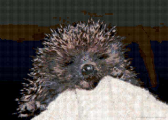 Ориентировочно так, схема вышивки «Ежик», созданная автором rusosh, будет выглядеть при отшиве на канве. Размер данной вышивки равен 190x136 крестов, при этом используется 41 цветов. Ключевые слова, по которым можно найти эту схему: природа, животные, ежик. Также, вы можете взглянуть на оригинальную картинку, соответствующую данной схеме вышивки.