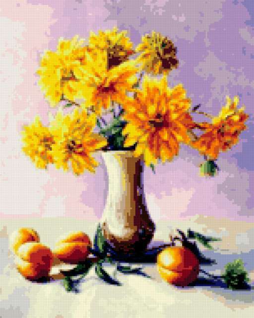Ориентировочно так, схема вышивки «Желтые георгины», созданная автором VA903M, будет выглядеть при отшиве на канве. Размер данной вышивки равен 152x190 крестов, при этом используется 46 цветов. Ключевые слова, по которым можно найти эту схему: цветы, натюрморт. Также, вы можете взглянуть на оригинальную картинку, соответствующую данной схеме вышивки.