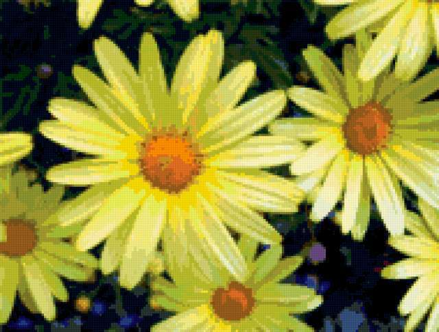 Ориентировочно так, схема вышивки «Желыте ромашки», созданная автором belka8, будет выглядеть при отшиве на канве. Размер данной вышивки равен 190x144 крестов, при этом используется 50 цветов. Ключевые слова, по которым можно найти эту схему: цветы, ромашки. Также, вы можете взглянуть на оригинальную картинку, соответствующую данной схеме вышивки.