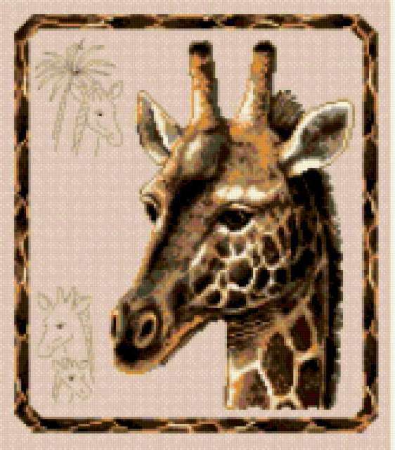 Ориентировочно так, схема вышивки «Жирафик», созданная автором nataliasop, будет выглядеть при отшиве на канве. Размер данной вышивки равен 167x190 крестов, при этом используется 63 цветов. Ключевые слова, по которым можно найти эту схему: жираф. Также, вы можете взглянуть на оригинальную картинку, соответствующую данной схеме вышивки.