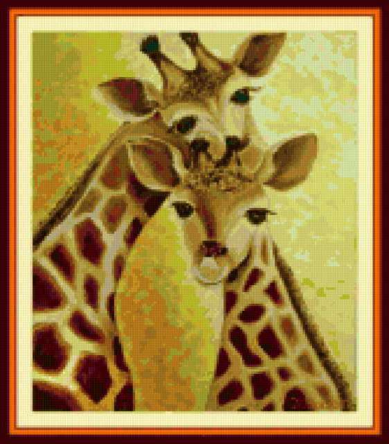 Ориентировочно так, схема вышивки «Жирафчики», созданная автором mgalimosca, будет выглядеть при отшиве на канве. Размер данной вышивки равен 167x190 крестов, при этом используется 55 цветов. Ключевые слова, по которым можно найти эту схему: жираф, животные, нежность. Также, вы можете взглянуть на оригинальную картинку, соответствующую данной схеме вышивки.