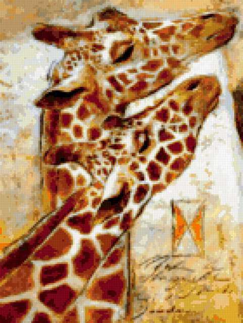 Ориентировочно так, схема вышивки «Жирафы», созданная автором gginn, будет выглядеть при отшиве на канве. Размер данной вышивки равен 140x186 крестов, при этом используется 57 цветов. Ключевые слова, по которым можно найти эту схему: животные, жираф. Также, вы можете взглянуть на оригинальную картинку, соответствующую данной схеме вышивки.