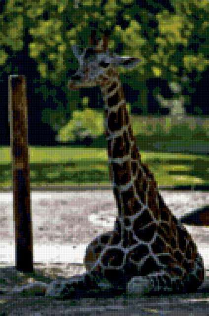 Ориентировочно так, схема вышивки «Жираф», созданная автором Karel, будет выглядеть при отшиве на канве. Размер данной вышивки равен 126x190 крестов, при этом используется 64 цветов. Ключевые слова, по которым можно найти эту схему: жираф, животные, звери. Также, вы можете взглянуть на оригинальную картинку, соответствующую данной схеме вышивки.