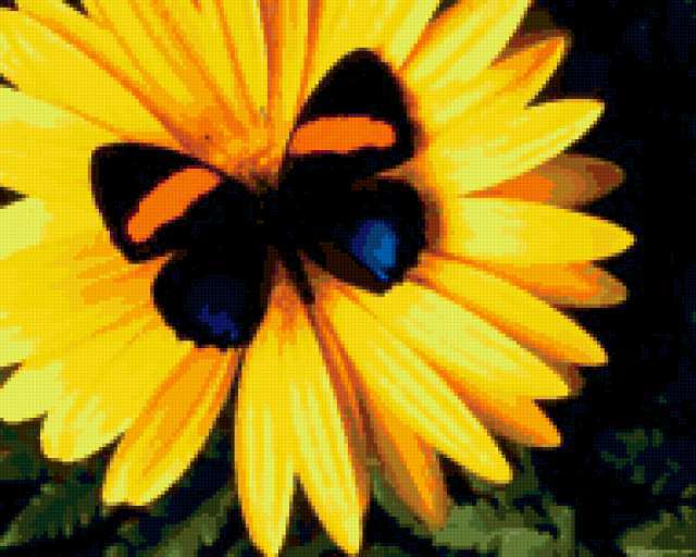 Ориентировочно так, схема вышивки «Жёлтое чудо», созданная автором Svetla_Nochka, будет выглядеть при отшиве на канве. Размер данной вышивки равен 190x152 крестов, при этом используется 43 цветов. Ключевые слова, по которым можно найти эту схему: цветы, flowers, цветок, растение, растения, бабочка, насекомые. Также, вы можете взглянуть на оригинальную картинку, соответствующую данной схеме вышивки.