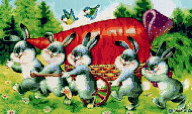 Ориентировочно так, схема вышивки «Зайцы с морковкой в детскую», созданная автором rybka6, будет выглядеть при отшиве на канве. Размер данной вышивки равен 190x113 крестов, при этом используется 45 цветов. Ключевые слова, по которым можно найти эту схему: заяц, кролик, детям, в детскую, сказка, мультик, морковь, морковка, подарок. Также, вы можете взглянуть на оригинальную картинку, соответствующую данной схеме вышивки.