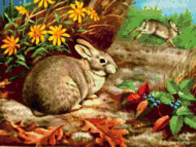 Ориентировочно так, схема вышивки «Зайцы», созданная автором VA903M, будет выглядеть при отшиве на канве. Размер данной вышивки равен 190x143 крестов, при этом используется 62 цветов. Ключевые слова, по которым можно найти эту схему: зайцы, картина, лес. Также, вы можете взглянуть на оригинальную картинку, соответствующую данной схеме вышивки.