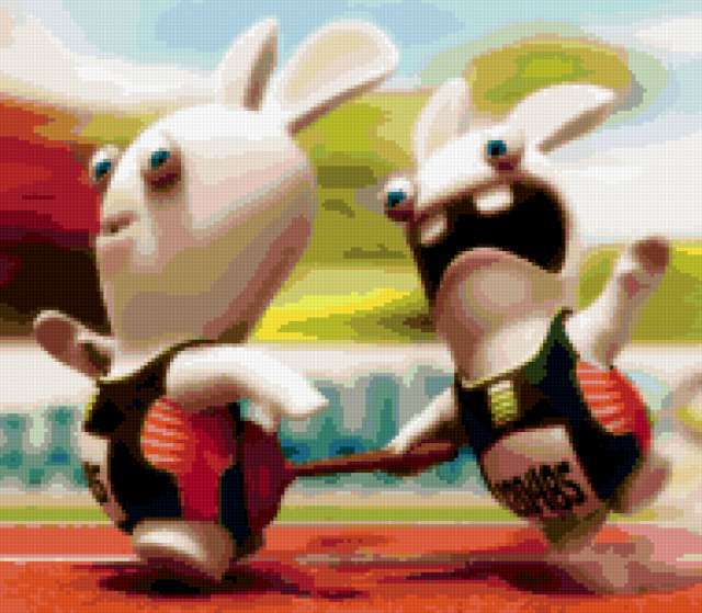 Ориентировочно так, схема вышивки «Зайчики-спортсмены», созданная автором annyshka_79_79, будет выглядеть при отшиве на канве. Размер данной вышивки равен 190x166 крестов, при этом используется 62 цветов. Ключевые слова, по которым можно найти эту схему: юмор, спорт, прикол, животные. Также, вы можете взглянуть на оригинальную картинку, соответствующую данной схеме вышивки.