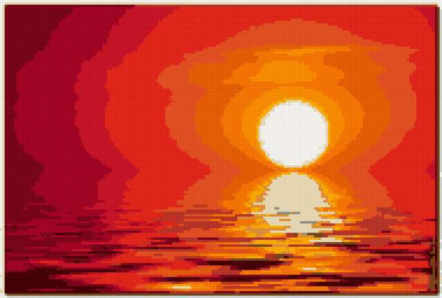 Ориентировочно так, схема вышивки «Закат», созданная автором Svetla_Nochka, будет выглядеть при отшиве на канве. Размер данной вышивки равен 190x128 крестов, при этом используется 17 цветов. Ключевые слова, по которым можно найти эту схему: природа, море, солнце, солнышко, закат. Также, вы можете взглянуть на оригинальную картинку, соответствующую данной схеме вышивки.