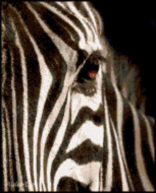 Ориентировочно так, схема вышивки «Зебра», созданная автором vlasovka, будет выглядеть при отшиве на канве. Размер данной вышивки равен 153x190 крестов, при этом используется 29 цветов. Ключевые слова, по которым можно найти эту схему: зебра, глаз, взгляд, животные. Также, вы можете взглянуть на оригинальную картинку, соответствующую данной схеме вышивки.