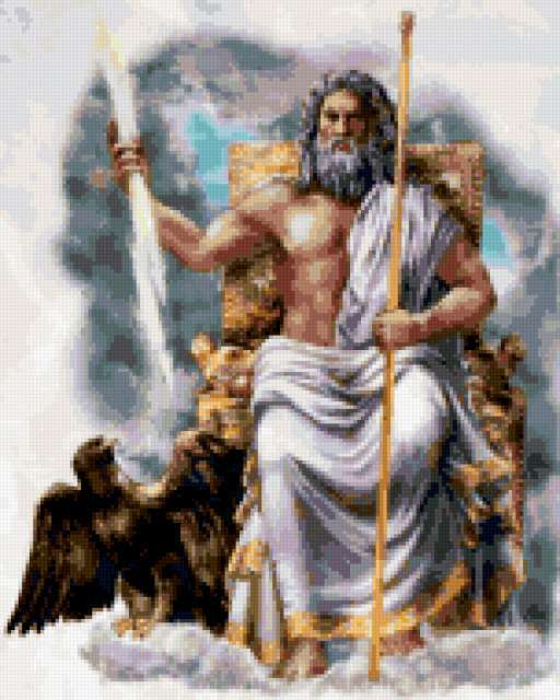 Ориентировочно так, схема вышивки «Зевс - бог неба», созданная автором Nadena_love, будет выглядеть при отшиве на канве. Размер данной вышивки равен 152x190 крестов, при этом используется 53 цветов. К несчастью, автор не назначил для схемы ключевые слова. Также, вы можете взглянуть на оригинальную картинку, соответствующую данной схеме вышивки.