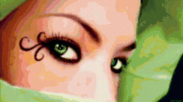 Ориентировочно так, схема вышивки «Зеленые глаза», созданная автором light2109, будет выглядеть при отшиве на канве. Размер данной вышивки равен 190x107 крестов, при этом используется 61 цветов. Ключевые слова, по которым можно найти эту схему: девушка, женщина, глаза, портрет, лицо. Также, вы можете взглянуть на оригинальную картинку, соответствующую данной схеме вышивки.