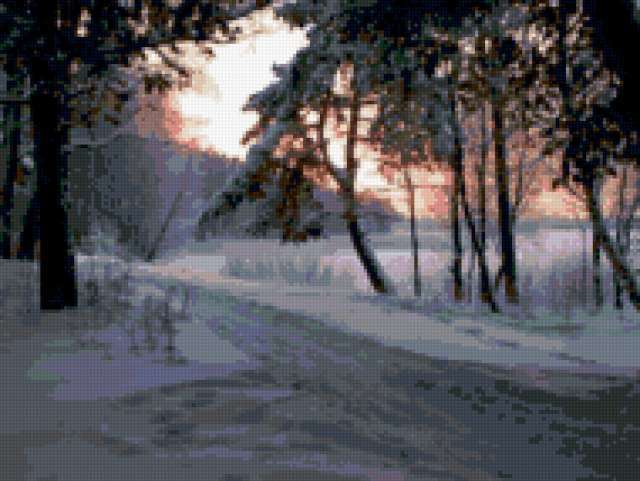 Ориентировочно так, схема вышивки «Зима», созданная автором Lynna-yna, будет выглядеть при отшиве на канве. Размер данной вышивки равен 190x143 крестов, при этом используется 51 цветов. Ключевые слова, по которым можно найти эту схему: зима, лес, пейзаж. Также, вы можете взглянуть на оригинальную картинку, соответствующую данной схеме вышивки.