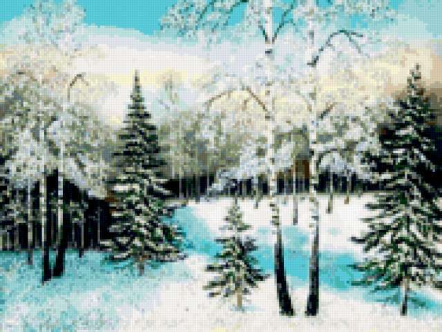 Ориентировочно так, схема вышивки «Зима», созданная автором marusya84, будет выглядеть при отшиве на канве. Размер данной вышивки равен 190x143 крестов, при этом используется 65 цветов. Ключевые слова, по которым можно найти эту схему: пейзаж, природа, лес, деревья, зима. Также, вы можете взглянуть на оригинальную картинку, соответствующую данной схеме вышивки.