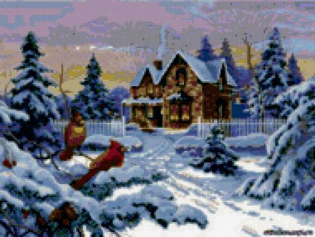 Ориентировочно так, схема вышивки «Зимний пейзаж», созданная автором -tatka-, будет выглядеть при отшиве на канве. Размер данной вышивки равен 190x143 крестов, при этом используется 66 цветов. Ключевые слова, по которым можно найти эту схему: пейзаж, природа. Также, вы можете взглянуть на оригинальную картинку, соответствующую данной схеме вышивки.