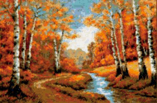 Ориентировочно так, схема вышивки «Золотая осень», созданная автором Juliy2802, будет выглядеть при отшиве на канве. Размер данной вышивки равен 190x125 крестов, при этом используется 60 цветов. Ключевые слова, по которым можно найти эту схему: пейзаж, лес, природа, осень, деревья, время года. Также, вы можете взглянуть на оригинальную картинку, соответствующую данной схеме вышивки.