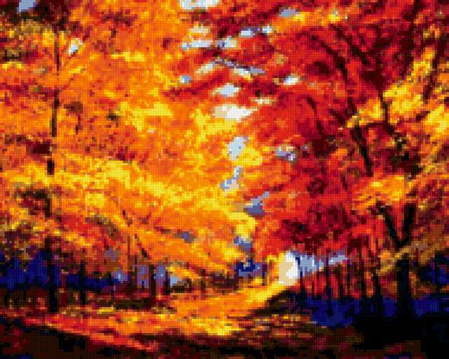 Ориентировочно так, схема вышивки «Золотая осень», созданная автором poltanya, будет выглядеть при отшиве на канве. Размер данной вышивки равен 190x152 крестов, при этом используется 51 цветов. Ключевые слова, по которым можно найти эту схему: осень, пейзаж, дорога, лес, картина, природа, живопись, красота, искусство. Также, вы можете взглянуть на оригинальную картинку, соответствующую данной схеме вышивки.