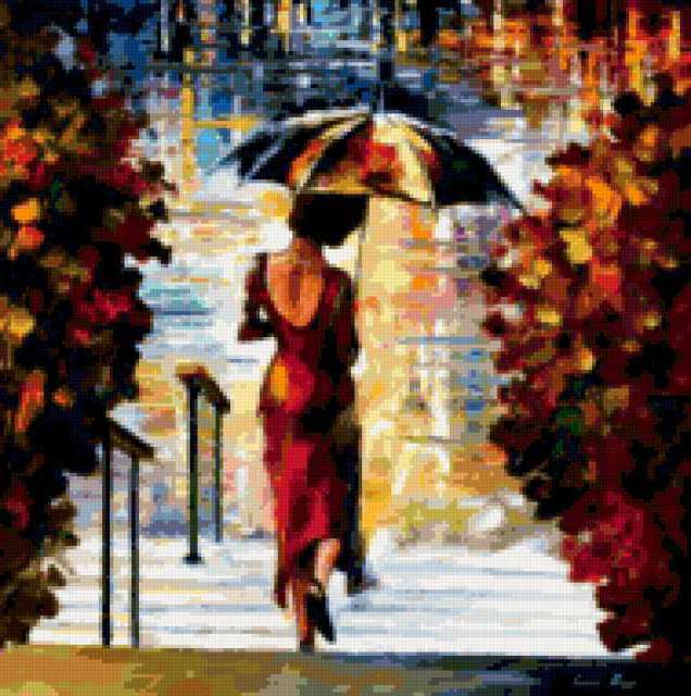 Ориентировочно так, схема вышивки «Зонтик», созданная автором olesya1587, будет выглядеть при отшиве на канве. Размер данной вышивки равен 189x190 крестов, при этом используется 84 цветов. К несчастью, автор не назначил для схемы ключевые слова. Также, вы можете взглянуть на оригинальную картинку, соответствующую данной схеме вышивки.