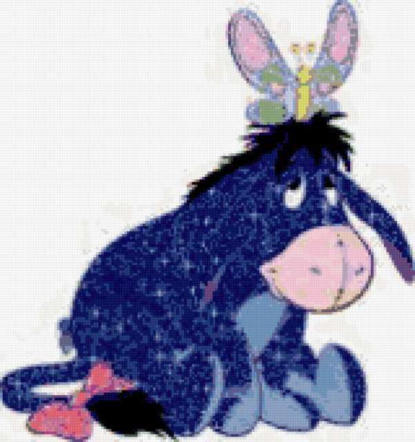 Ориентировочно так, схема вышивки «Иа», созданная автором abdrashevasweta, будет выглядеть при отшиве на канве. Размер данной вышивки равен 160x170 крестов, при этом используется 42 цветов. Ключевые слова, по которым можно найти эту схему: мультик. Также, вы можете взглянуть на оригинальную картинку, соответствующую данной схеме вышивки.