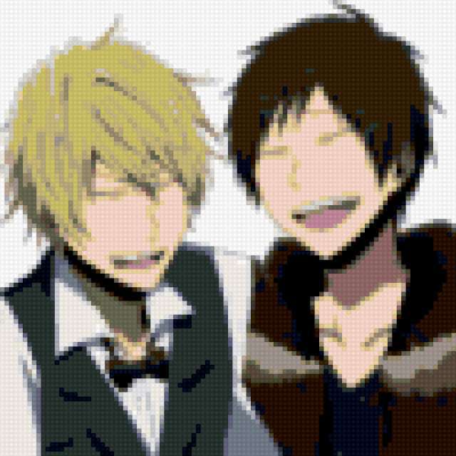Ориентировочно так, схема вышивки «Изая и Шизуо», созданная автором Lenko-san, будет выглядеть при отшиве на канве. Размер данной вышивки равен 100x100 крестов, при этом используется 40 цветов. К несчастью, автор не назначил для схемы ключевые слова. Также, вы можете взглянуть на оригинальную картинку, соответствующую данной схеме вышивки.