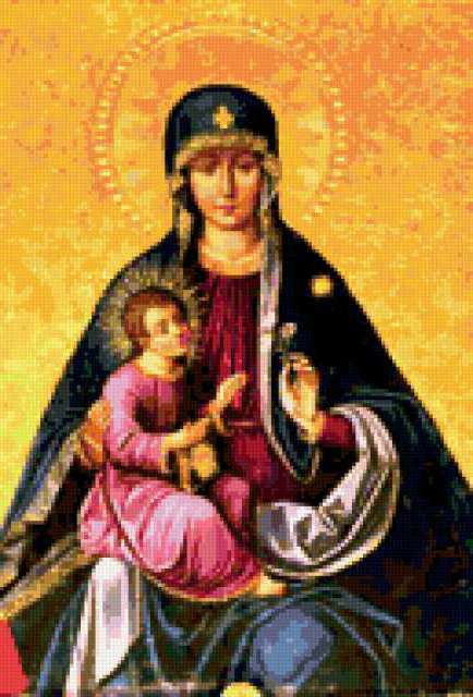 Ориентировочно так, схема вышивки «Икона в тракай», созданная автором zita, будет выглядеть при отшиве на канве. Размер данной вышивки равен 129x190 крестов, при этом используется 74 цветов. Ключевые слова, по которым можно найти эту схему: икона, религия, мария, мать. Также, вы можете взглянуть на оригинальную картинку, соответствующую данной схеме вышивки.