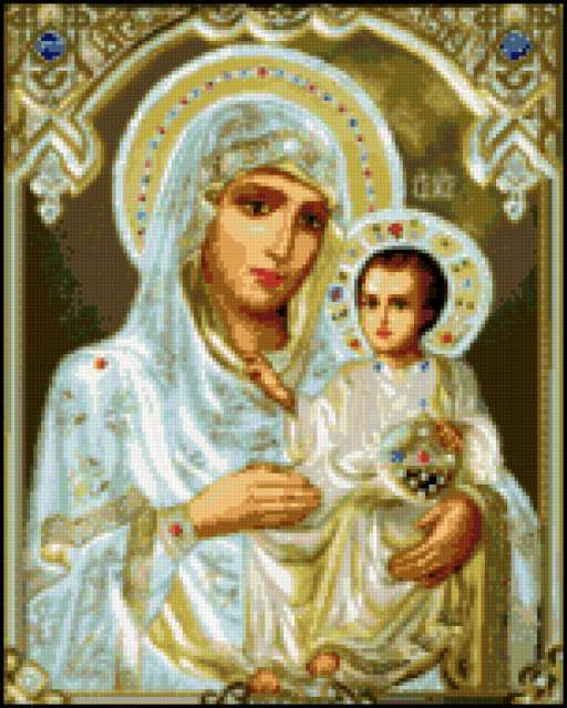Ориентировочно так, схема вышивки «Икона», созданная автором -tatka-, будет выглядеть при отшиве на канве. Размер данной вышивки равен 152x190 крестов, при этом используется 64 цветов. Ключевые слова, по которым можно найти эту схему: иконы, божья матерь. Также, вы можете взглянуть на оригинальную картинку, соответствующую данной схеме вышивки.