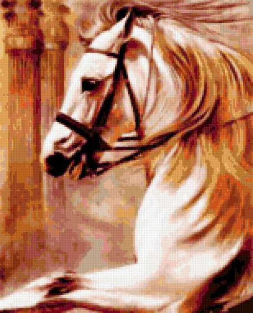 Ориентировочно так, схема вышивки «Императорский конь», созданная автором alena4, будет выглядеть при отшиве на канве. Размер данной вышивки равен 154x190 крестов, при этом используется 38 цветов. Ключевые слова, по которым можно найти эту схему: конь, лошадь, скакун, животное, жеребец. Также, вы можете взглянуть на оригинальную картинку, соответствующую данной схеме вышивки.
