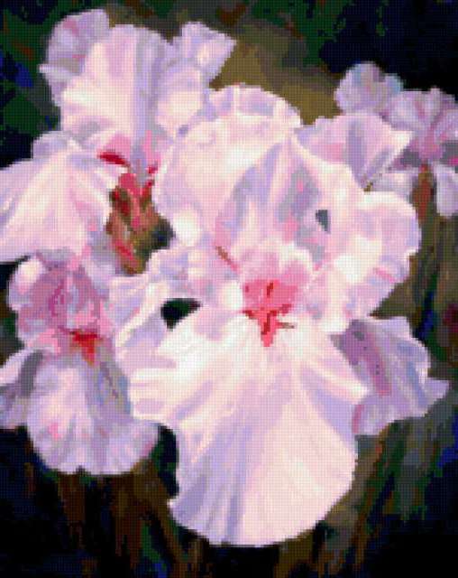 Ориентировочно так, схема вышивки «Ирисы», созданная автором Cadykova, будет выглядеть при отшиве на канве. Размер данной вышивки равен 151x190 крестов, при этом используется 58 цветов. Ключевые слова, по которым можно найти эту схему: цветы, букет, ирисы, белый, розовый. Также, вы можете взглянуть на оригинальную картинку, соответствующую данной схеме вышивки.