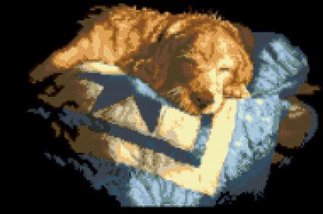 Ориентировочно так, схема вышивки «Ирландский сеттер», созданная автором mist-life, будет выглядеть при отшиве на канве. Размер данной вышивки равен 190x126 крестов, при этом используется 32 цветов. Ключевые слова, по которым можно найти эту схему: сеттер, собака, пес, спящий. Также, вы можете взглянуть на оригинальную картинку, соответствующую данной схеме вышивки.