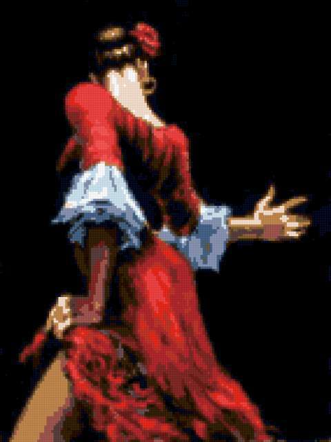 Ориентировочно так, схема вышивки «Испанка», созданная автором AnettaRU57, будет выглядеть при отшиве на канве. Размер данной вышивки равен 142x189 крестов, при этом используется 26 цветов. Ключевые слова, по которым можно найти эту схему: испанка, девушка, страсть, танец. Также, вы можете взглянуть на оригинальную картинку, соответствующую данной схеме вышивки.