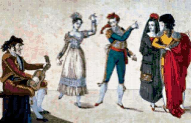 Ориентировочно так, схема вышивки «Испанский театр», созданная автором Melisenta, будет выглядеть при отшиве на канве. Размер данной вышивки равен 190x123 крестов, при этом используется 73 цветов. Ключевые слова, по которым можно найти эту схему: танец, испания, театр, картина, живопись, люди. Также, вы можете взглянуть на оригинальную картинку, соответствующую данной схеме вышивки.