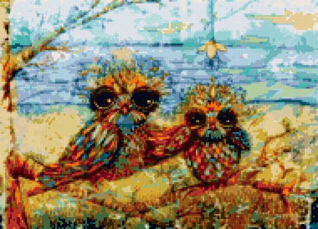 Ориентировочно так, схема вышивки «КТ_044», созданная автором DevouR, будет выглядеть при отшиве на канве. Размер данной вышивки равен 190x137 крестов, при этом используется 40 цветов. Ключевые слова, по которым можно найти эту схему: две совы, сова. Также, вы можете взглянуть на оригинальную картинку, соответствующую данной схеме вышивки.
