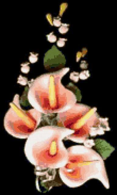 Ориентировочно так, схема вышивки «Каалы и ландыши», созданная автором katik, будет выглядеть при отшиве на канве. Размер данной вышивки равен 110x183 крестов, при этом используется 47 цветов. Ключевые слова, по которым можно найти эту схему: калы, цветы. Также, вы можете взглянуть на оригинальную картинку, соответствующую данной схеме вышивки.
