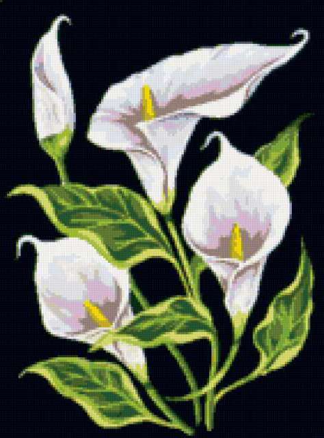 Ориентировочно так, схема вышивки «Калы», созданная автором VA903M, будет выглядеть при отшиве на канве. Размер данной вышивки равен 141x190 крестов, при этом используется 34 цветов. Ключевые слова, по которым можно найти эту схему: цветы, калы. Также, вы можете взглянуть на оригинальную картинку, соответствующую данной схеме вышивки.