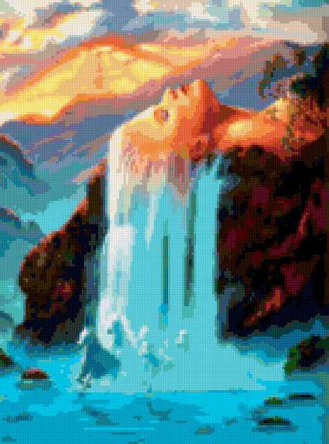 Ориентировочно так, схема вышивки «Картина», созданная автором allllla, будет выглядеть при отшиве на канве. Размер данной вышивки равен 141x190 крестов, при этом используется 59 цветов. Ключевые слова, по которым можно найти эту схему: девушка, она, фентези, лошадки, девушки, портрет, женские образы, картина, природа, водопад, лошади, животные, кони, скакуны. Также, вы можете взглянуть на оригинальную картинку, соответствующую данной схеме вышивки.