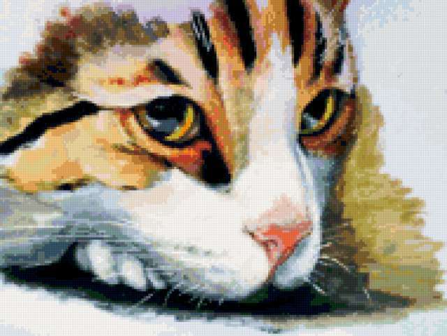 Ориентировочно так, схема вышивки «Киска», созданная автором xeufq21, будет выглядеть при отшиве на канве. Размер данной вышивки равен 190x143 крестов, при этом используется 82 цветов. Ключевые слова, по которым можно найти эту схему: кошка, животные, киска, глаза, взгляд, подушка. Также, вы можете взглянуть на оригинальную картинку, соответствующую данной схеме вышивки.