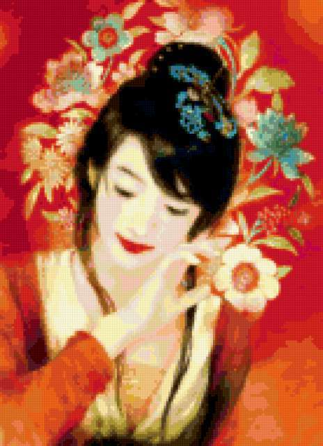 Ориентировочно так, схема вышивки «Китайская девушка», созданная автором Nadena_love, будет выглядеть при отшиве на канве. Размер данной вышивки равен 138x190 крестов, при этом используется 69 цветов. К несчастью, автор не назначил для схемы ключевые слова. Также, вы можете взглянуть на оригинальную картинку, соответствующую данной схеме вышивки.