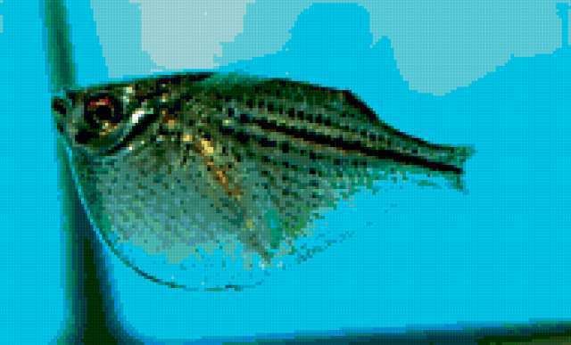 Ориентировочно так, схема вышивки «Клинобрюшка», созданная автором avevstigneeva, будет выглядеть при отшиве на канве. Размер данной вышивки равен 190x115 крестов, при этом используется 48 цветов. Ключевые слова, по которым можно найти эту схему: рыбки. Также, вы можете взглянуть на оригинальную картинку, соответствующую данной схеме вышивки.