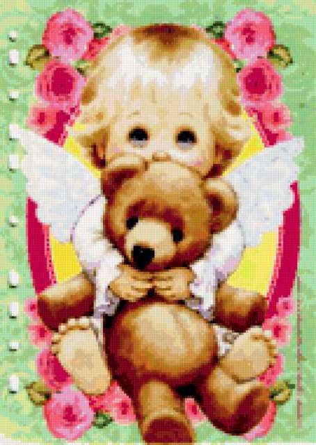 Ориентировочно так, схема вышивки «Коллекция "Ruth Morehead"», созданная автором Krista021, будет выглядеть при отшиве на канве. Размер данной вышивки равен 135x190 крестов, при этом используется 73 цветов. Ключевые слова, по которым можно найти эту схему: ребенок. ангел, малыш, игрушка, мишка, тедди, рамка, букет, цветок, роза. Также, вы можете взглянуть на оригинальную картинку, соответствующую данной схеме вышивки.