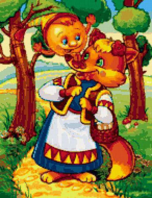 Ориентировочно так, схема вышивки «Колобок», созданная автором malkinaiv, будет выглядеть при отшиве на канве. Размер данной вышивки равен 146x190 крестов, при этом используется 49 цветов. Ключевые слова, по которым можно найти эту схему: иллюстрации, сказки, пейзаж, лиса, колобок, детям, в детскую, для детей. Также, вы можете взглянуть на оригинальную картинку, соответствующую данной схеме вышивки.
